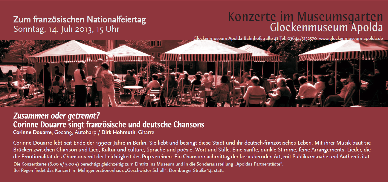 Zum französischen Nationalfeiertag, 14.7.2013, 15.00 Uhr, Konzert im Museumsgarten Apolda:
