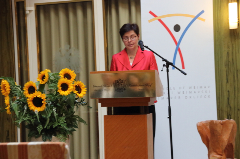 Honorarkonsulin der Republik Frankreich in Thüringen Bärbel Grönegres hielten die Grußworte. Förderer des Weimarer-Dreieck-Preises 2015 sind: Sparkasse Mittelthüringen, Grand Hotel Russischer Hof