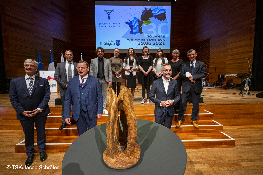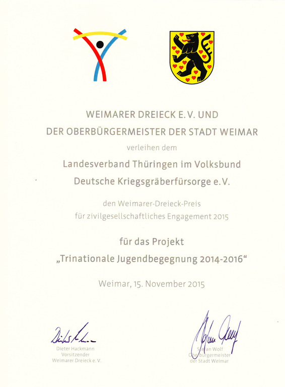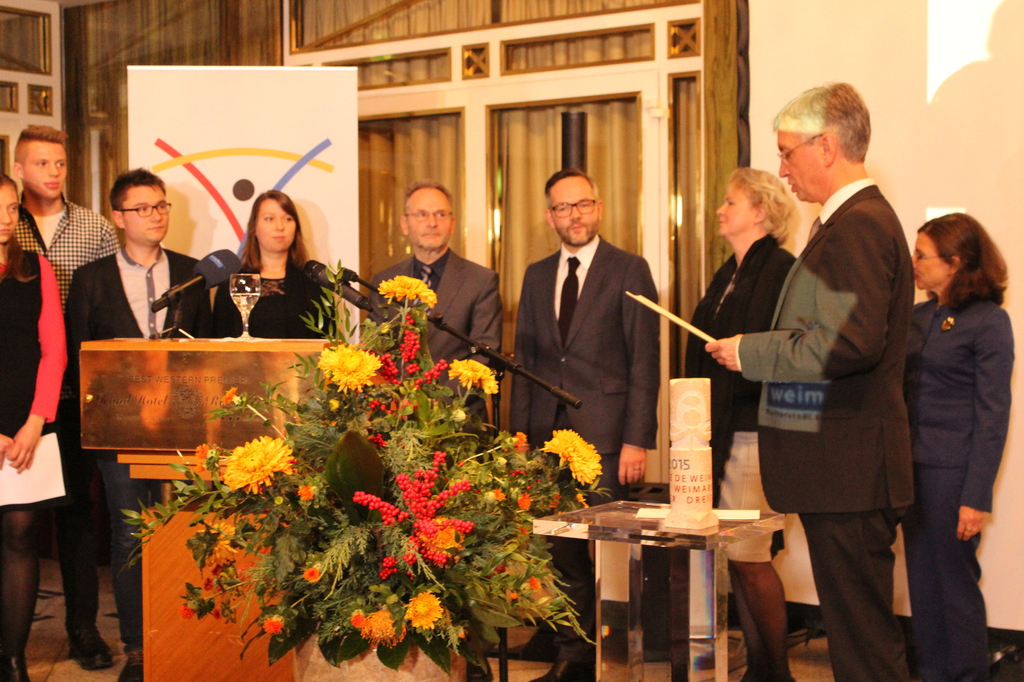 Der Landesverband Thüringen wurde beispielhaft für sein zeitgemäßes zivilgesellschaftliches Engagement im Bildungsbereich im Sinne des Weimarer Dreiecks ausgezeichnet. Hinter dem trinationalen