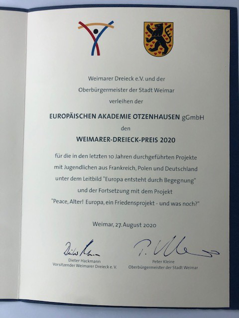 Der 9. Weimarer-Dreieck-Preis 2020 wurde im 10. Jahr des Bestehens des Weimarer Dreieck e.V. an die Europäische Akademie Otzenhausen gGmbH in würdiger Form verliehen.
