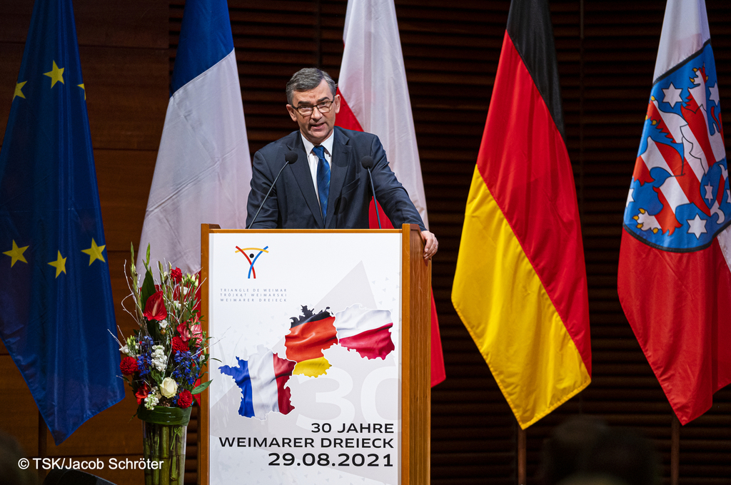 Oberbürgermeister Stefan Wolf betonte die Intention des Weimarer-Dreieck-Preises: „Weimar darf sich nicht darauf beschränken, Kulisse für politisches Symbolhandeln zwischen Deutschland, Frankreich