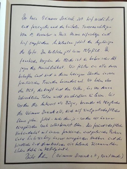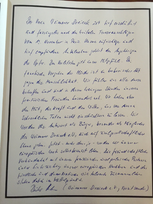 "Der Verein Weimarer Dreieck e.V. ist tief erschüttert und fassungslos nach den brutalen Terroranschlägen vom 13. November in Paris. Unsere aufrichtige und tief empfundene Anteilnahme gehört