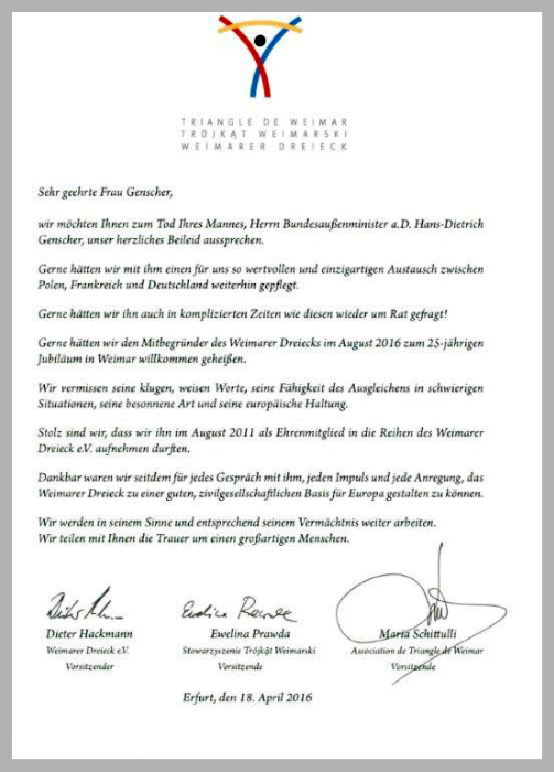 Wir trauern um unser Ehrenmitglied im Weimarer Dreieck e.V. Hans-Dietrich Genscher.
